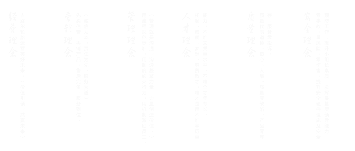 吉路尔人站在一个发展中的制高点,摒弃传统生产模式,大力推进新旧动能转换,提高智能制造装备水平,加大力度改进自动化连续生产工艺,全力继续提高产品质量,全身心投入到研发新时代、新空间、新需求、新型全适应性轮胎产品。“做高端品质化运营的引领者”是我们亘古不变的纲领;“用平台成就员工、用产品造福社会”是我们毕生的使命;"托起、成就、梦想”是我们崇尚完美的境界。我们将带着美好的夙愿、用我们的勤劳和智慧来实现我们的员工梦、企业梦、中国梦。